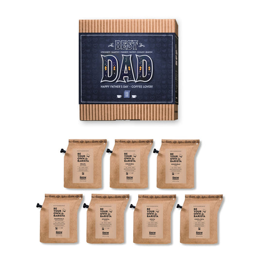 Dads are the best in the world, and so should be their coffee!Choose our exclusive Father's day gift boxes and pamper your superstar father with a world-class coffee experience!7 pcs gift box includes speciality Coffee brewers with coffee from 7 different coffee farms: Brazil*, Costa Rica**, Kenya**, Colombia**, Guatemala**, Honduras**...