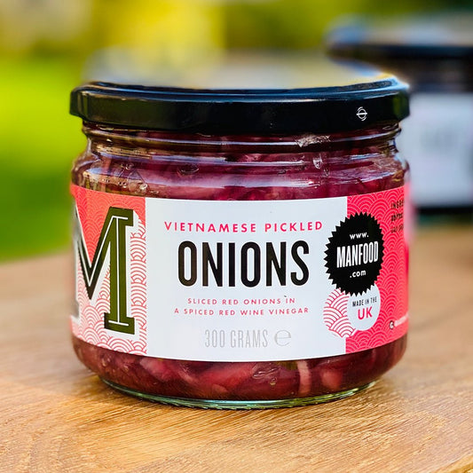Sliced red onions in a spiced red wine vinegar – perfect for a Banh Mi sandwich.300g Ingredients: Red wine vinegar (contains sulphites), red onion, sugar, star anise, salt, Sichuan peppercorns, coriander seed, red chilli.