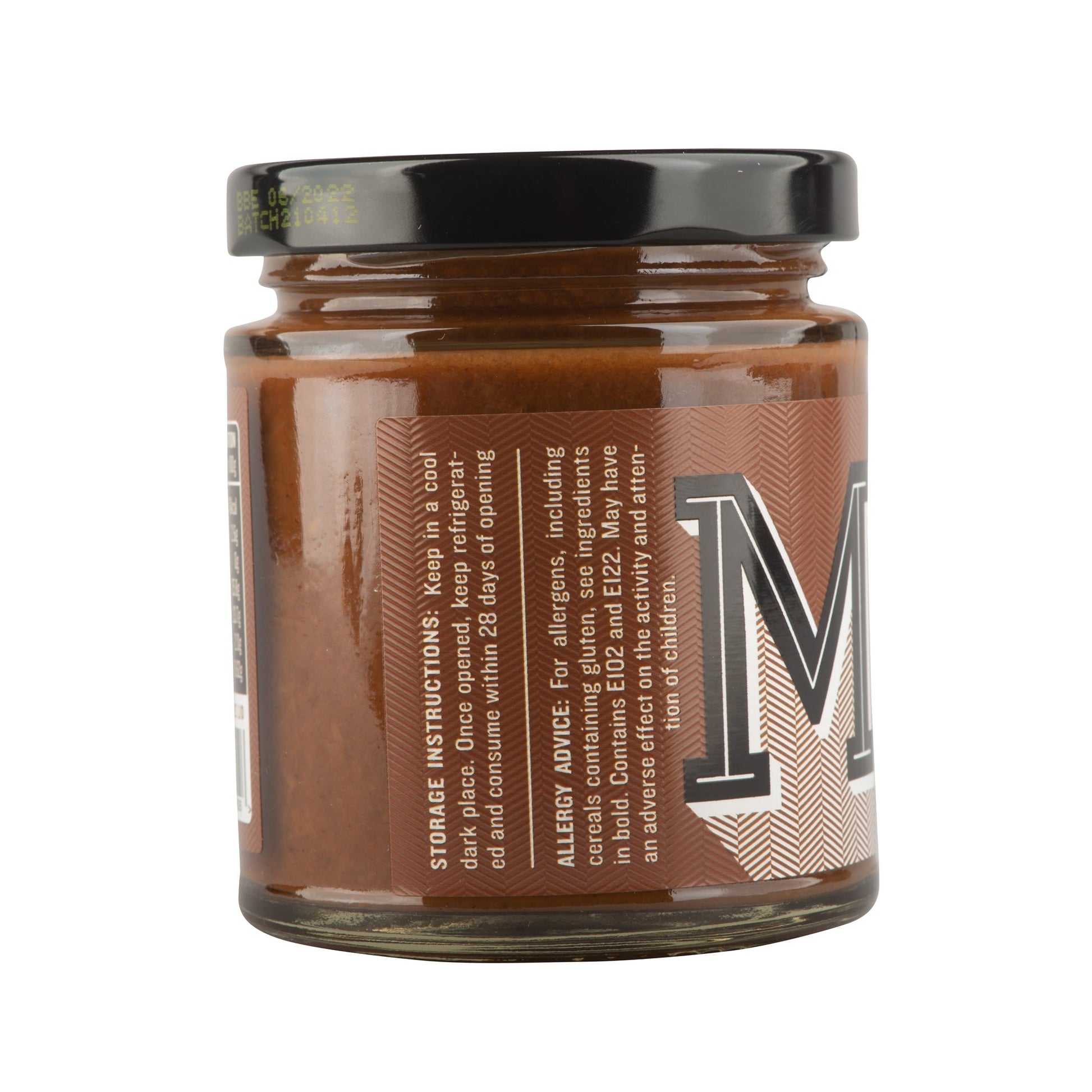 Ingredients: Sultanas, Beer (contains Barley)(13.8%), Orange juice, Onion, Red wine vinegar (contain sulphites), Tomato ketchup (water, tomatoes, modified starch, sugar, salt, vinegar, preservative:potassium sorbate, spices, sweetener (sodium saccharin), flavouring, colouring E102, E122), Dijon Mustard (water, mustard seeds, spirit vinegar), Worcestershire sauce (malt vinegar (from Barley), spirit vinegar, molasses, sugar, salt, anchovies (Fish), tamarind extract, onions, garlic, spice, flavourings), Dark Brown Sugar, Garlic, Celery salt, Cornflour, Black pepper, Cayenne pepper, Salt.