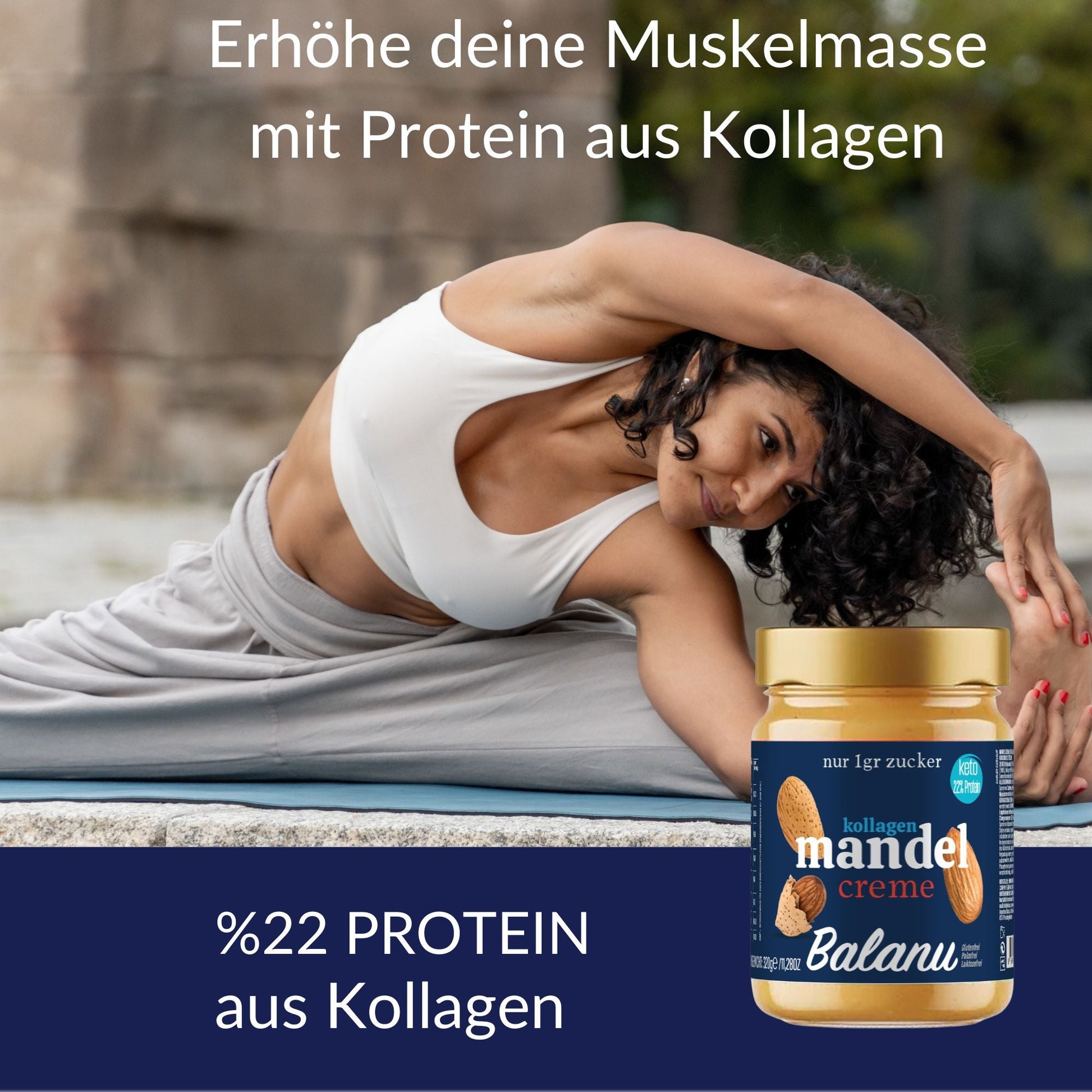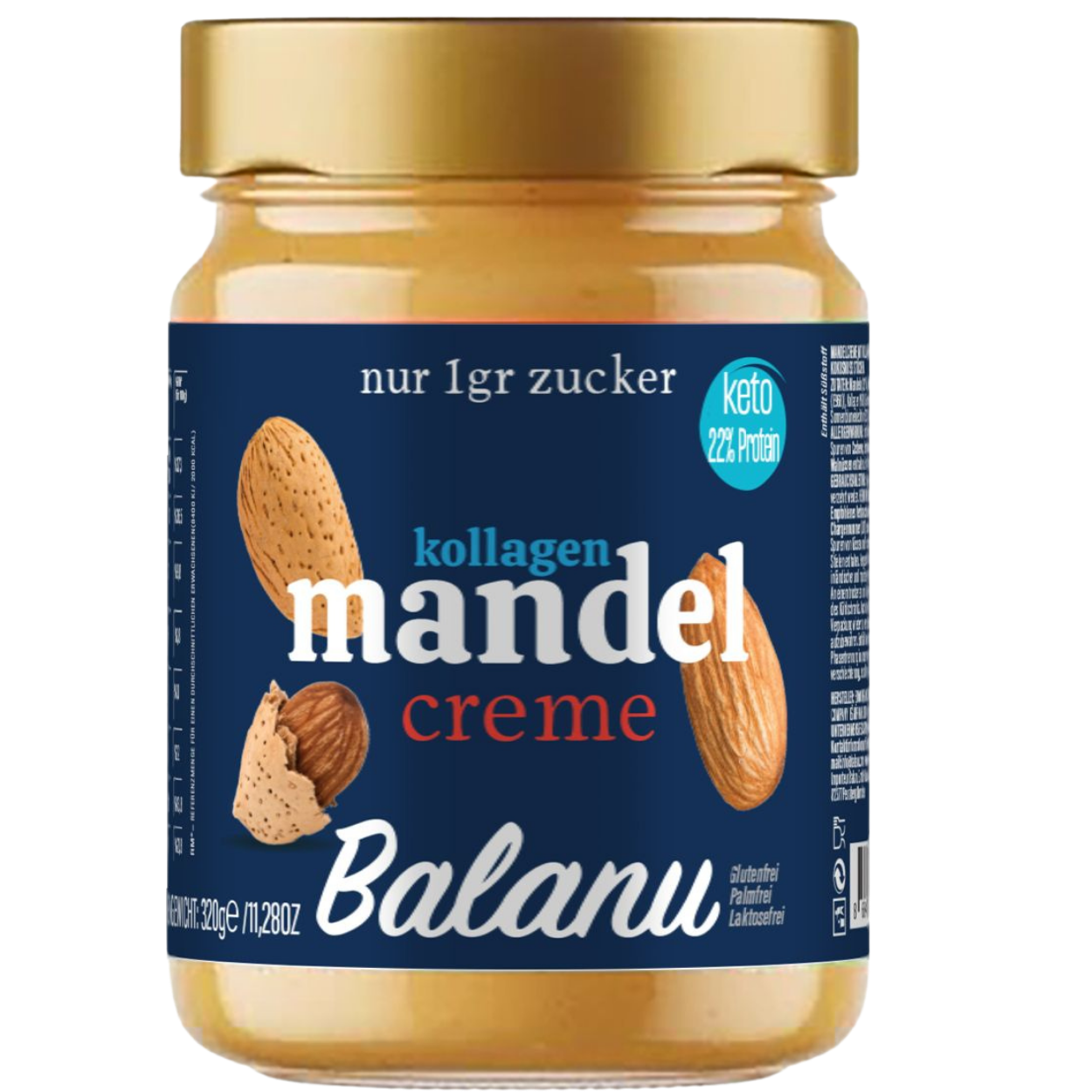 ZUTATEN: Mandel (32%), Haselnussöl, Süßstoff (Erythrit (E968)), Kollagen(18%),