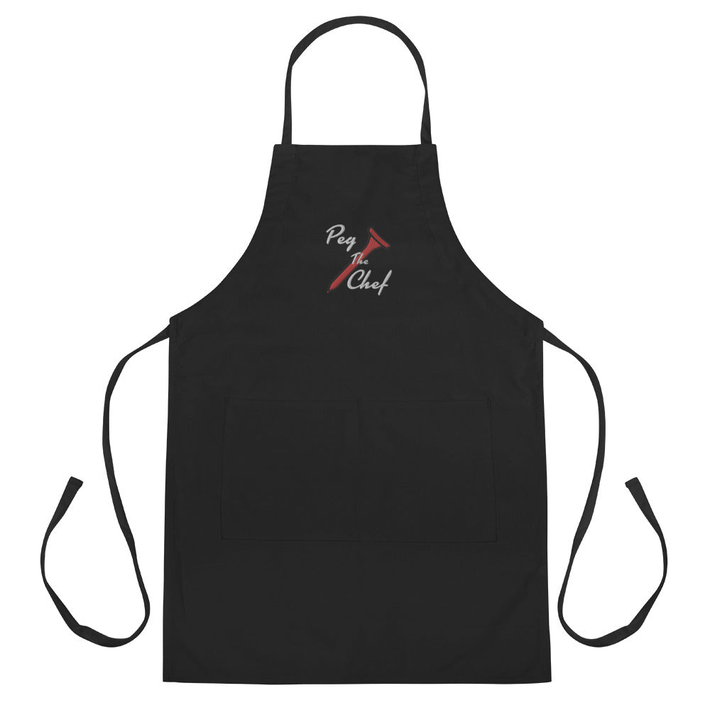 A black apron featuring an embroidered design on the front. The words Peg the Chef in cursive sit over top of a peg from the famous Cracker Barrel game. Double entendre and all that stuff. Giggity.