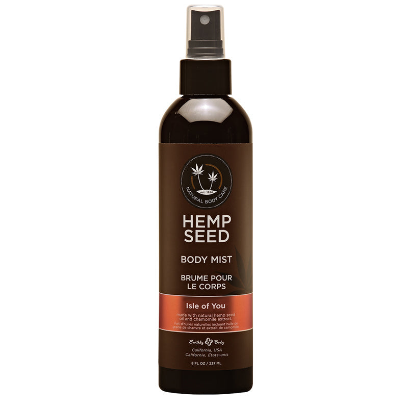 A fragrant, refreshing spray that moisturizes and invigorates your skin. This light, seductive spray nourishes your face and body with hemp and pure botanicals. Use this alcohol-free mist to refresh linens and carpets, a lightweight perfume, or toss in the fridge for the cool blast of freshness on a hot day. Isle of You scent is a combination of coconut water, citrus and vanilla. 8 oz.