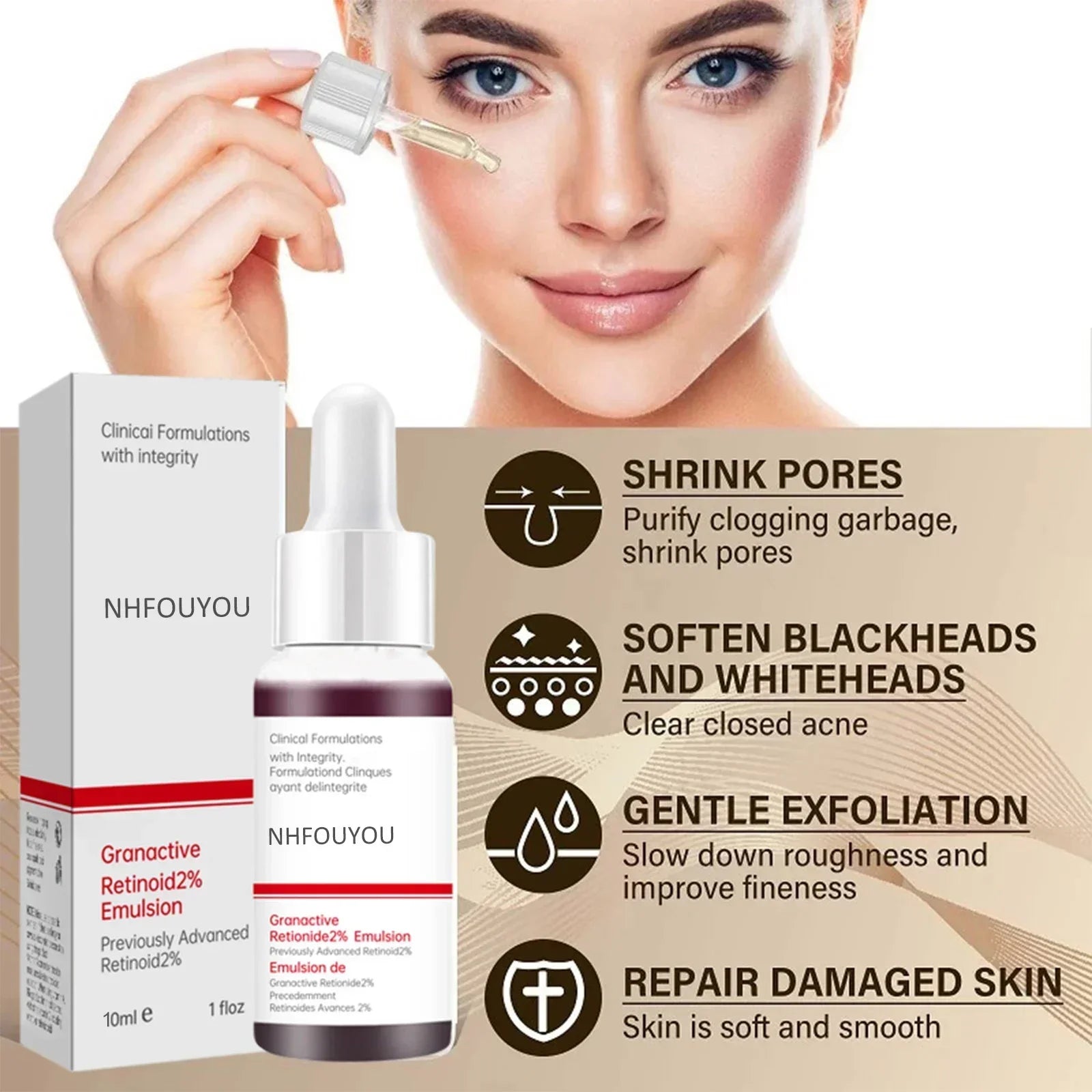 Gently massage the serum onto your face, focusing on areas with fine lines and enlarged pores.