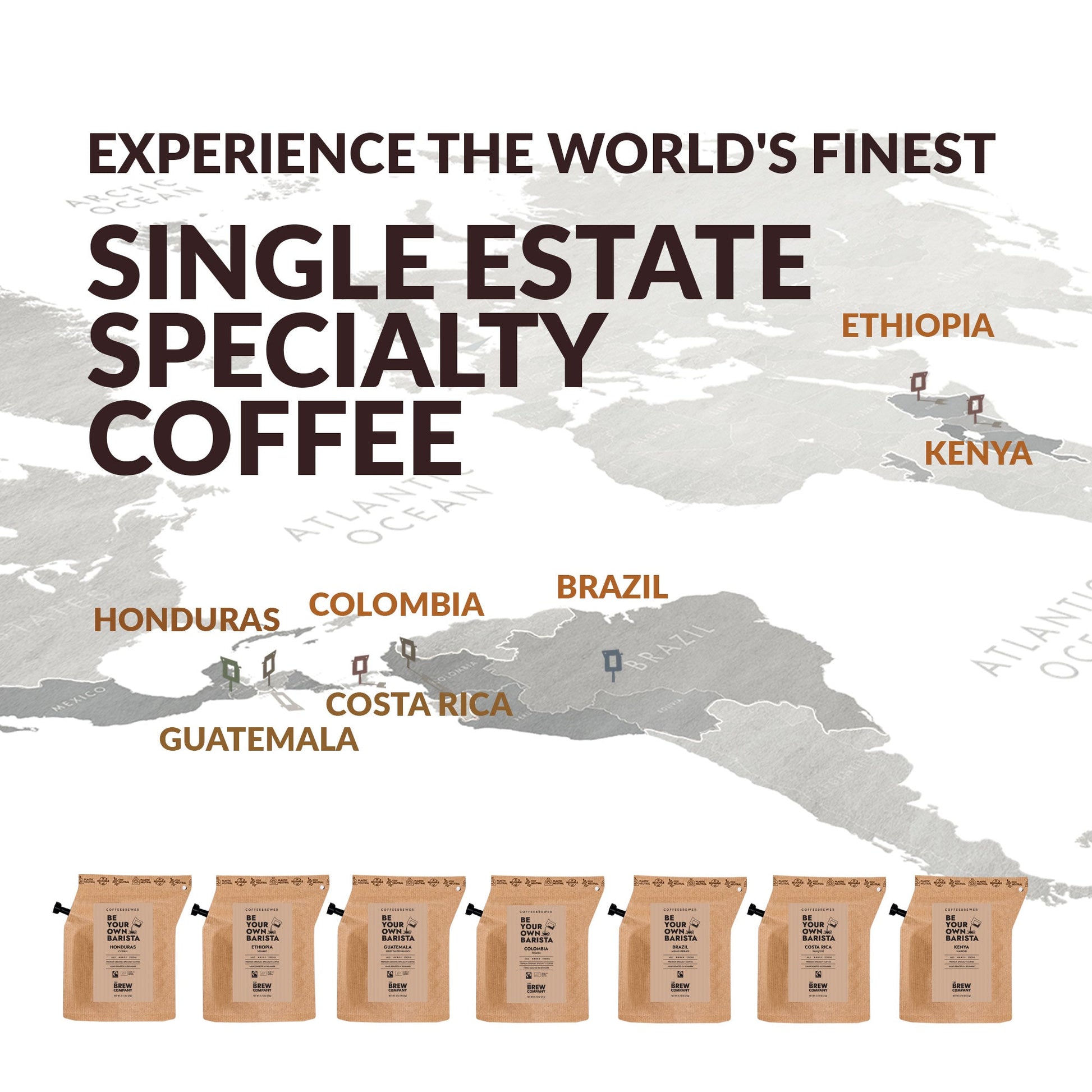 7 pcs gift box includes specialty Coffeebrewers with coffee from 7 different coffee farms: Brazil*, Costa Rica**, Kenya**, Colombia**, Guatemala**, Honduras** and Ethiopia**.