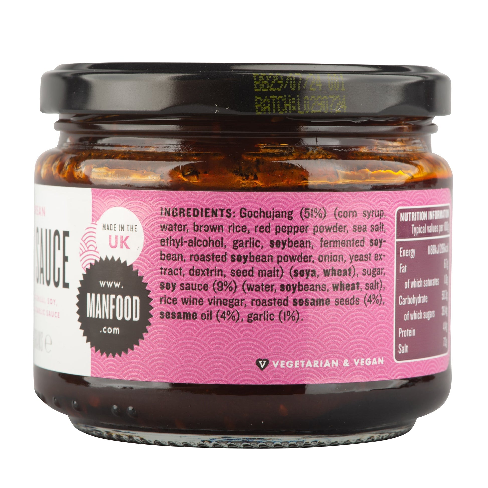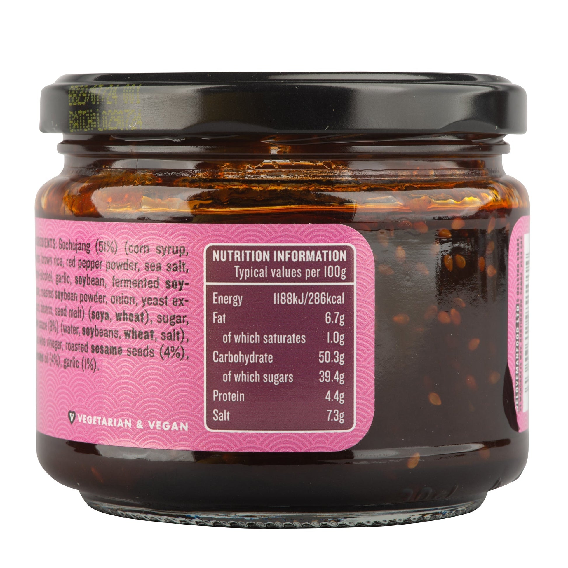 Ingredients: Gochujang (51%) (corn syrup, water, brown rice, red pepper powder, sea salt, ethyl-alcohol, garlic, soybean, fermented soybean, roasted soybean powder, onion, yeast extract, dextrin, seed malt) (Soya, Wheat), Sugar, Soy Sauce (9%) (water, soybeans, wheat, salt), Rice Wine Vinegar, Roasted Sesame Seeds (4%), Sesame Oil (4%), Garlic (1%).