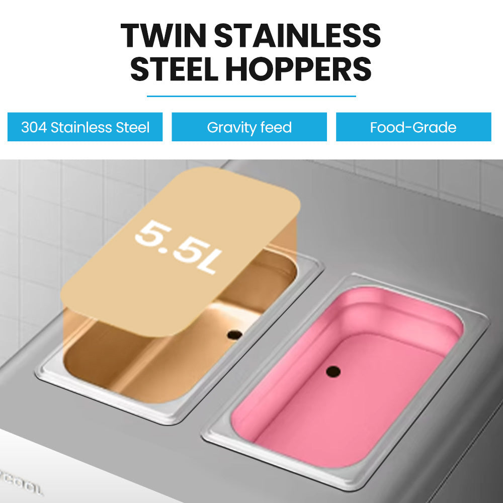 With twin 5.5L stainless steel hoppers and a gravity-fed system, it serves 200-275 portions to effortlessly meet high demand.
